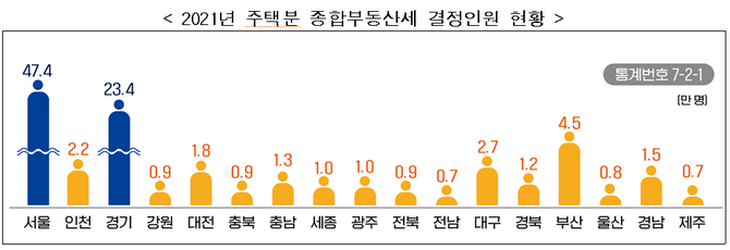지역별 주택분 종부세 신고 인원 가운데 서울(47.4만명)과 경기(23.4만명) 지역이 전체 93.1만 명 가운데 76.0%에 달했다.