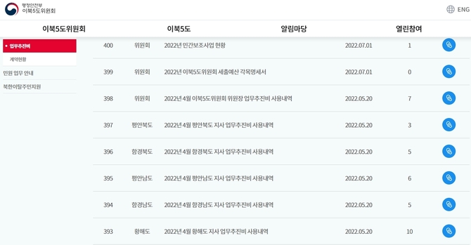 실제 업무추진비 가장 상단의 게시물은 올해 1월 20일 게시된 ‘2021년 12월 함경북도지사 업무추진비 사용내역’인 것으로 조사됐다.