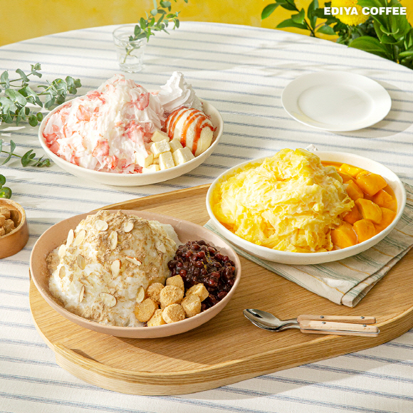 한편 이디야커피는 올해 ‘1인 빙수’ 3종(▲팥인절미 ▲망고패션 요거놀라 ▲딸기피치 요거놀라)과 ‘눈꽃빙수’ 3종(▲팥인절미 ▲망고 ▲딸기치즈)을 포함하여 총 6종의 빙수를 선보였다.