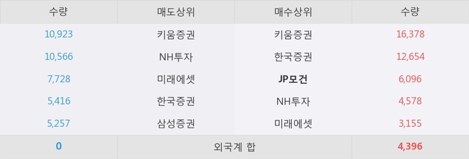 거래원 동향은 JP모건, NH투자, 미래에셋 등이 매수 상위 목록에 나타나고 있다.