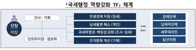 또한, 국세청 차장 밑에 국세행정 역량강화 TF 만들어 세무행정에서 국민이 체감하는 성과를 내도록 운영‧관리한다.