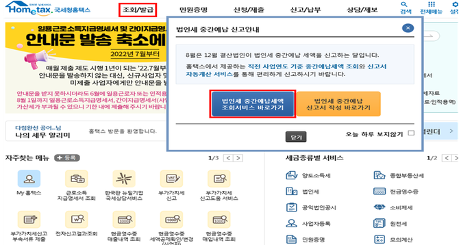 신고 전 홈택스 ‘중간예납 세액조회 서비스’를 통해 직전 사업연도 산출세액 기준 중간예납 예상세액을 확인할 수 있으며, 홈택스‧손택스 미리채움(Pre-filled) 서비스룰 통해 간편 신고, 납부도 가능하다.