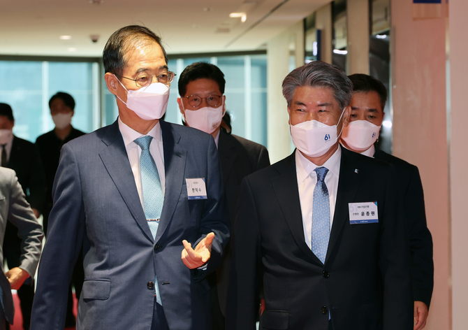 이날 행사에는 윤종원 IBK기업은행 행장도 참석했는데, 윤 행장은 앞서 한 총리와 한 팀을 이루는 새 정부 초대 국무조정실장으로 거론됐다가 고사한 바 있다.
