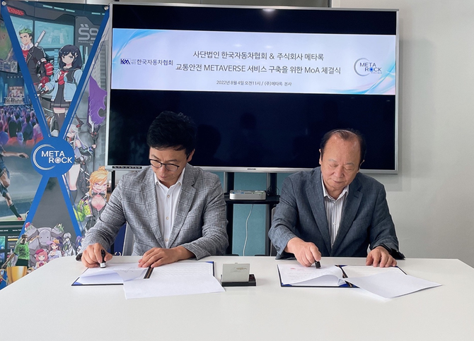 한국자동차협회는 성공적인 “교통 안전 교육 메타버스 서비스”를 기획, 개발하기 위하여 지난 4일 메타버스 전문 기업인 (주)메타록(대표 서해영)과 합의서(Memorandum of Agreement)를 체결하고 본격적인 사업 추진 준비에 들어갔다고 8일 밝혔다.