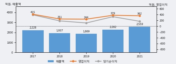최근 실적을 살펴보면 2021년 매출액이 최근 5년 중 가장 높은 실적을 기록했음을 알 수 있다. 이전 최고 실적이었던 2020년 보다도 12.2%(277억 7천만원) 늘어난 것으로 나타났다.