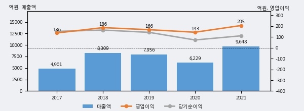 최근 실적을 살펴보면 2021년 매출액이 최근 5년 중 가장 높은 실적을 기록했음을 알 수 있다. 이전 최고 실적이었던 2018년 보다도 16.1%(1339억 5천만원) 늘어난 것으로 나타났다.