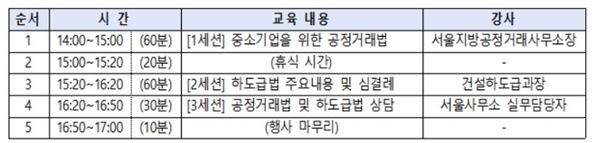 이 행사는 법 위반 예방 차원에서 기업 임직원들에게 공정거래법, 하도급법의 주요 내용과 불공정거래 행위 유형을 설명하고 기업들이 겪는 어려움을 상담하기 위해 마련됐다.