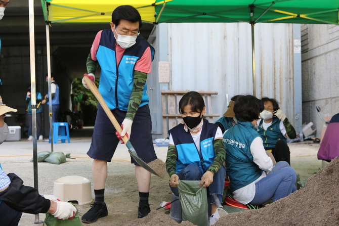 한국세무사회는 우선 지난 18일 반포종합운동장 내에 설치된 서초구자원봉사센터에서 반포천 빗물펌프장 하천 범람방지 모래주머니 만드는 작업에 참여했다.