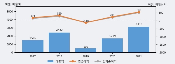 최근 실적을 살펴보면 2021년 매출액이 최근 5년 중 가장 높은 실적을 기록했음을 알 수 있다. 이전 최고 실적이었던 2018년 보다도 28.0%(681억 1천만원) 늘어난 것으로 나타났다.
