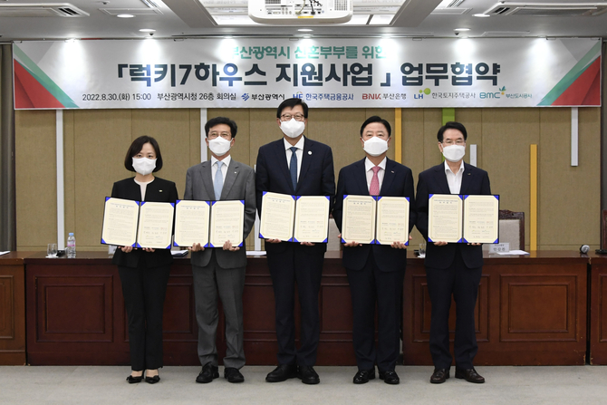 (조세금융신문=진민경 기자) BNK부산은행(은행장 안감찬)은 30일 오후, 부산시청에서 부산광역시, 한국주택금융공사, 한국토지주택공사, 부산도시공사와 공동으로 ‘부산시 신혼부부 럭키7 하우스 지원 사업’ 업무협약을 체결했다고 밝혔다.