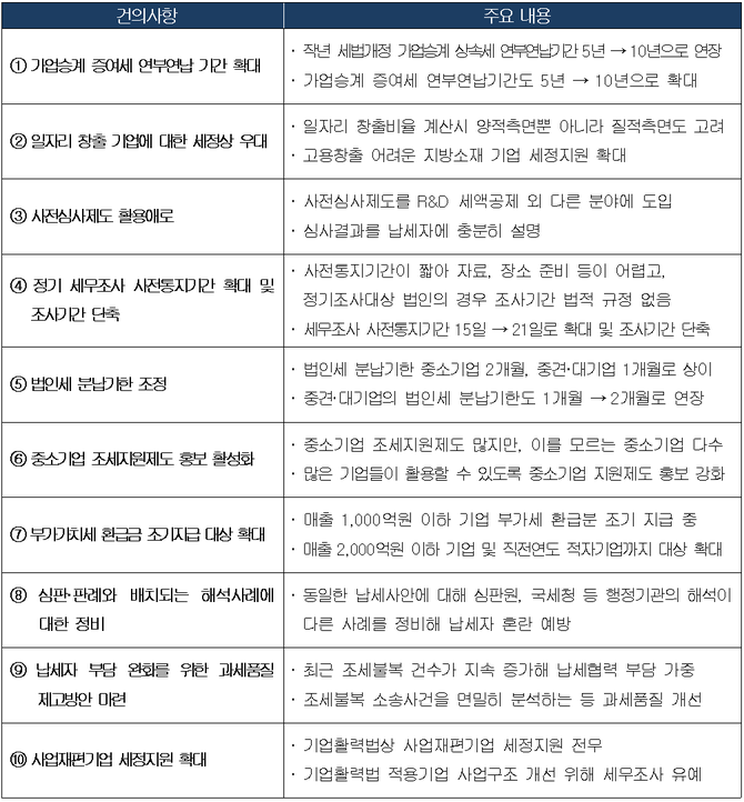 또한, 중소기업 조세지원제도 홍보 활성화, 부가가치세 환급금 조기지급 대상 확대, 심판·판례와 배치되는 해석사례에 대한 정비, 납세자 부담 완화를 위한 과세품질 제고방안 마련, 사업재편기업 세정지원 확대를 요청했다,