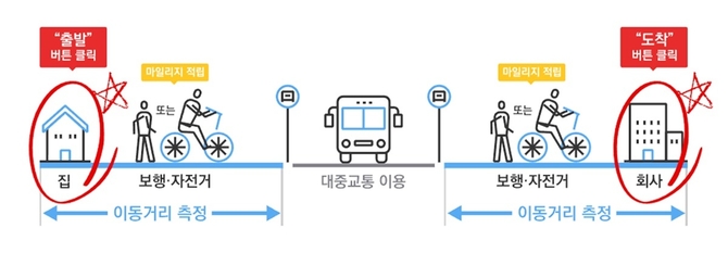 거주지 등에서 출발할 때 앱에서 '출발 버튼'을 클릭하고 버스 승·하차 후 목적지에 도착해 '도착 버튼'을 클릭하면 현금 마일리지가 적립되는데, 이동 거리에 따라 교통비 2천원 미만인 경우 최대 250원, 2천~3천원은 350원, 3천원 이상은 450원까지 차등 적립된다.