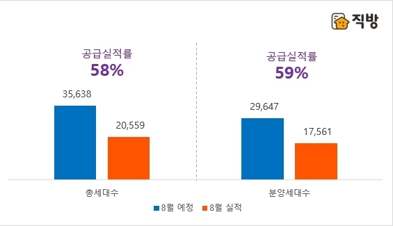 직방이 7월 28일 기준 조사한 8월 분양예정단지는 51개 단지로 총 3만5638가구, 일반분양 2만9647가구였다. 이를 재조사한 결과 실제 분양이 이루어진 단지는 36개 단지, 총 2만559가구, 일반분양 1만7561가구다.