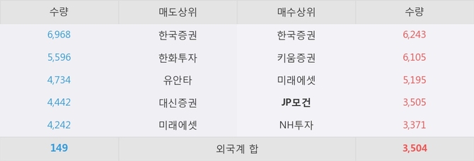 이 시각 주요 거래원은 미래에셋, 한국증권, 한화투자 등이 매도 상위 창구에 자리하고 있다. 한편, 매수 창구 상위에는 JP모건이 눈에 띄고 있다.