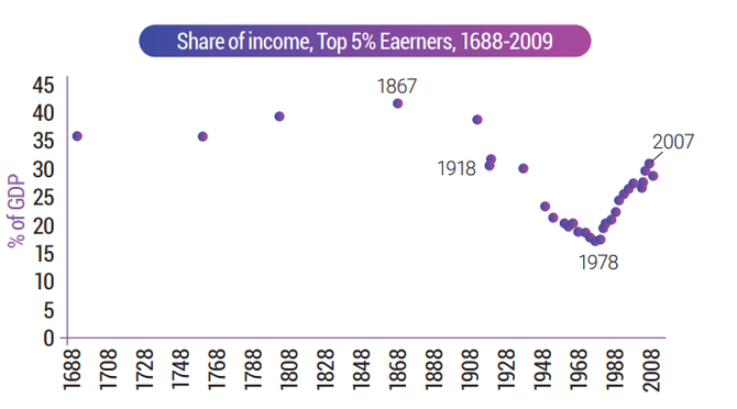 아래 그림에서 확인할 수 있듯이 상위 소득 5%에 속한 사람들이 전체 소득의 절반이 사라진, 그야말로 불평등의 끝판왕이라고 할 수 있는 시대였습니다. 그래프의 오른쪽 2007년~2009년 하고 견주어 보더라도 비교가 되지 않을 정도였습니다. 그러나 마르크스의 바람대로 혁명은 성공하지 못했고 자본주의는 지옥 같은 불평등과 함께 계속해서 성장해 갔습니다.