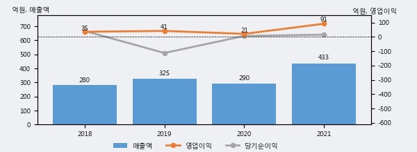 최근 실적을 살펴보면 2021년 매출액이 최근 4년 중 가장 높은 실적을 기록했음을 알 수 있다. 이전 최고 실적이었던 2019년 보다도 33.0%(107억 5천만원) 늘어난 것으로 나타났다.