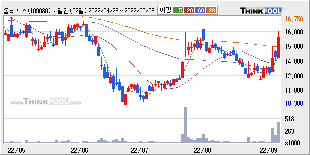 옵티시스의 2021년 매출액은 전년대비 18.4% 늘어난 242억원이고, 영업이익 또한 전년대비 170.1% 늘어난 42억원을 기록했다. 이 회사의 매출액 증감률과 영업이익 증감률은 각각 코스닥 상위 41%, 상위 16%에 해당된다.
