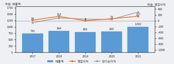 최근 실적을 살펴보면 2021년 매출액이 최근 5년 중 가장 높은 실적을 기록했음을 알 수 있다. 이전 최고 실적이었던 2018년 보다도 18.7%(157억 6천만원) 늘어난 것으로 나타났다.