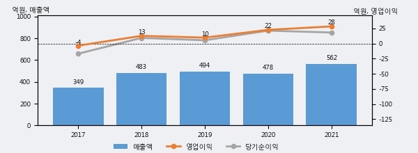 최근 실적을 살펴보면 2021년 매출액이 최근 5년 중 가장 높은 실적을 기록했음을 알 수 있다. 이전 최고 실적이었던 2019년 보다도 13.7%(67억 9천만원) 늘어난 것으로 나타났다.