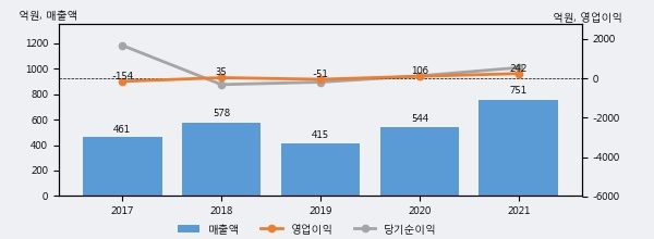 최근 실적을 살펴보면 2021년 매출액이 최근 5년 중 가장 높은 실적을 기록했음을 알 수 있다. 이전 최고 실적이었던 2018년 보다도 30.1%(173억 9천만원) 늘어난 것으로 나타났다.