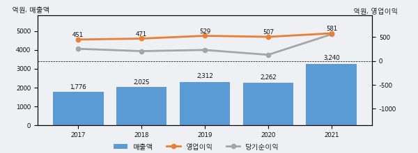 최근 실적을 살펴보면 2021년 매출액이 최근 5년 중 가장 높은 실적을 기록했음을 알 수 있다. 이전 최고 실적이었던 2019년 보다도 40.1%(927억 6천만원) 늘어난 것으로 나타났다.