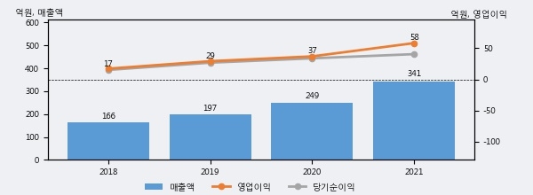 위세아이텍의 2021년 매출액은 전년대비 37.0% 늘어난 341억원이고, 영업이익 또한 전년대비 57.9% 늘어난 58억원을 기록했다. 이 회사의 매출액 증감률과 영업이익 증감률은 각각 코스닥 상위 20%, 상위 36%에 해당된다.