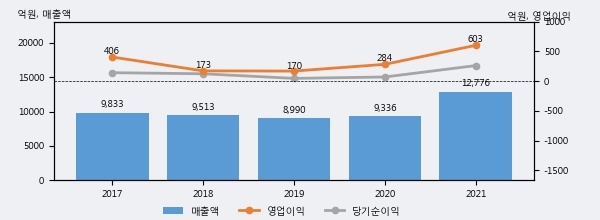 최근 실적을 살펴보면 2021년 매출액이 최근 5년 중 가장 높은 실적을 기록했음을 알 수 있다. 이전 최고 실적이었던 2017년 보다도 29.9%(2943억 5천만원) 늘어난 것으로 나타났다.