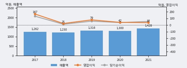 최근 실적을 살펴보면 2021년 매출액이 최근 5년 중 가장 높은 실적을 기록했음을 알 수 있다. 이전 최고 실적이었던 2019년 보다도 8.5%(112억 4천만원) 늘어난 것으로 나타났다.