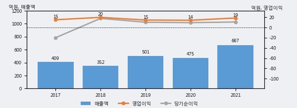 최근 실적을 살펴보면 2021년 매출액이 최근 5년 중 가장 높은 실적을 기록했음을 알 수 있다. 이전 최고 실적이었던 2019년 보다도 33.1%(165억 9천만원) 늘어난 것으로 나타났다.