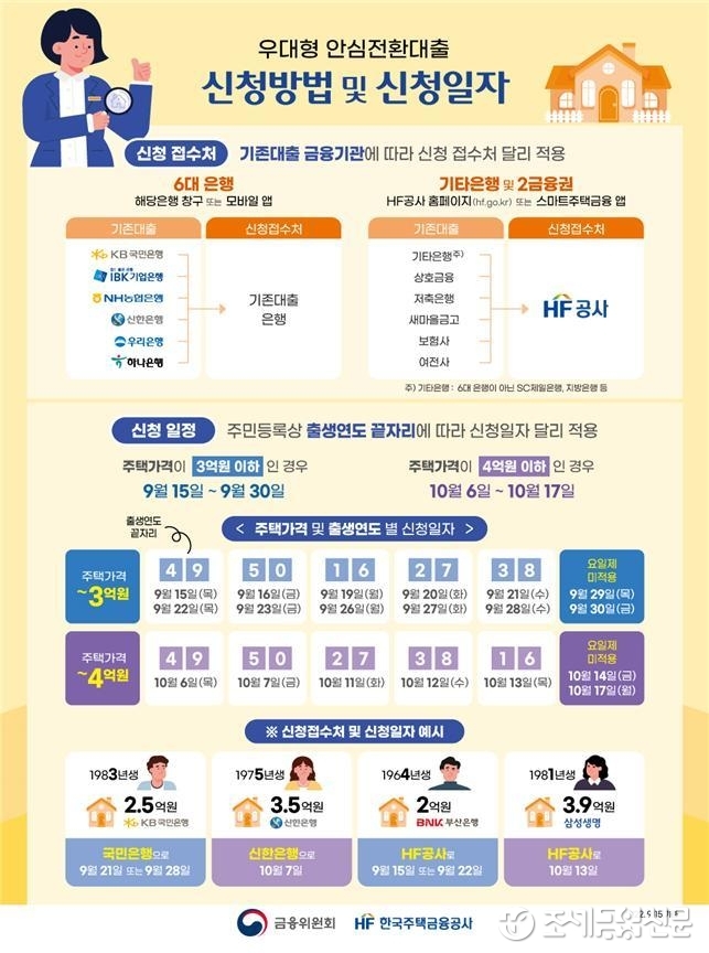 15일 금융위원회는 국민·신한·농협·우리·하나·기업은행 등 6대 은행과 주택금융공사(주금공)에서 이날부터 안심전환대출 신청을 받는다고 밝혔다.