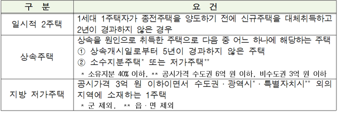 종부세 주택 수에서 일시적 2주택, 상속주택, 지방 저가주택을 제외해 1세대 1주택자 판정을 받을 수 있는 길이 열렸지만, 무조건은 아니고 자신의 조건을 따져봐야 한다.