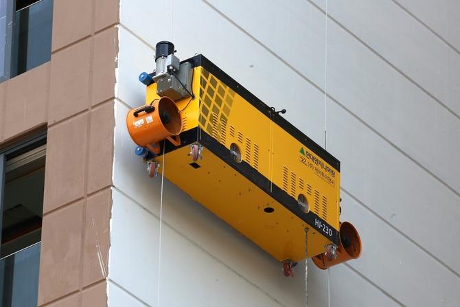 현대엔지니어링과 도장전문업체 제이투이앤씨가 공동개발한 '외벽도장로봇'은 건물에 설치된 와이어를 따라 수직 승하강하며, 4개의 노즐로 도료를 분사해 원격으로 도장 작업을 가능하게 해주는 스마트 건설장비다.