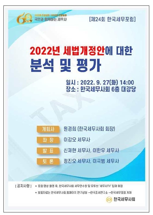 (조세금융신문=이지한 기자) 제24회 세무포럼이 27일 '2022 세법개정안에 대한 분석 및 평가'라는 주제로 개최된다.