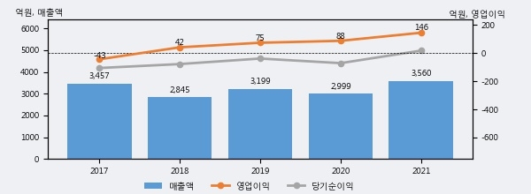 최근 실적을 살펴보면 2021년 매출액이 최근 5년 중 가장 높은 실적을 기록했음을 알 수 있다. 이전 최고 실적이었던 2017년 보다도 3.0%(103억 6천만원) 늘어난 것으로 나타났다.