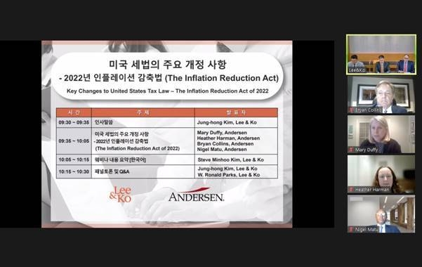 (조세금융신문=고승주 기자) 법무법인 광장과 미국 대형 세무법인인 앤더슨(Andersen)이 지난 20일 미국 인플레이션 감축법에 따른 미국의 주요 세법 개정사항을 설명했다.