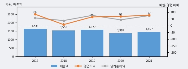 SJM의 2021년 매출액은 전년대비 5.1% 늘어난 1457억원이고, 영업이익 또한 전년대비 14.0% 늘어난 77억원을 기록했다. 이 회사의 매출액 증감률과 영업이익 증감률은 각각 코스피 하위 30%, 하위 46%에 해당된다.
