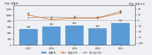최근 실적을 살펴보면 2021년 매출액이 최근 5년 중 가장 높은 실적을 기록했음을 알 수 있다. 이전 최고 실적이었던 2019년 보다도 12.8%(83억 7천만원) 늘어난 것으로 나타났다.