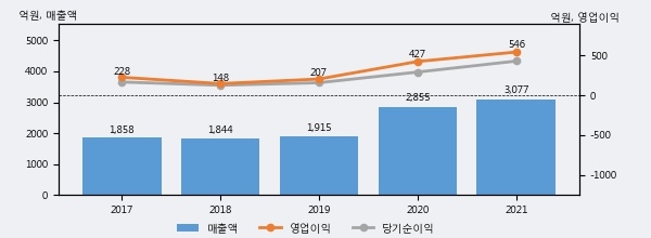 최근 3년간의 실적을 살펴보면 안정적 성장세를 보이고 있다. 최근 3년간 매출로 볼 때 매년 증가하고 있다. 다만 최근에 그 증가폭이 다소 감소하고 있다.