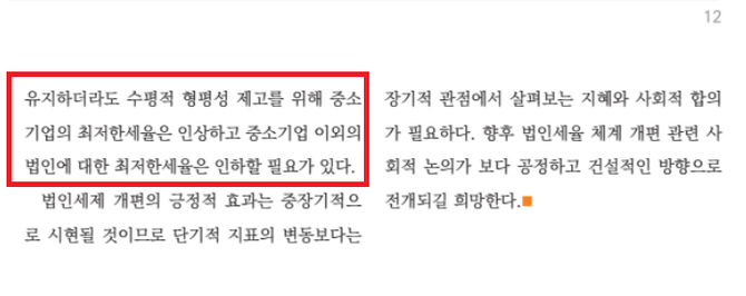 김학수 선임연구위원 보고서의 결론은 중소기업 실효세율을 올리고, 중견‧대기업 실효세율을 낮춰야 한다는 것이다.