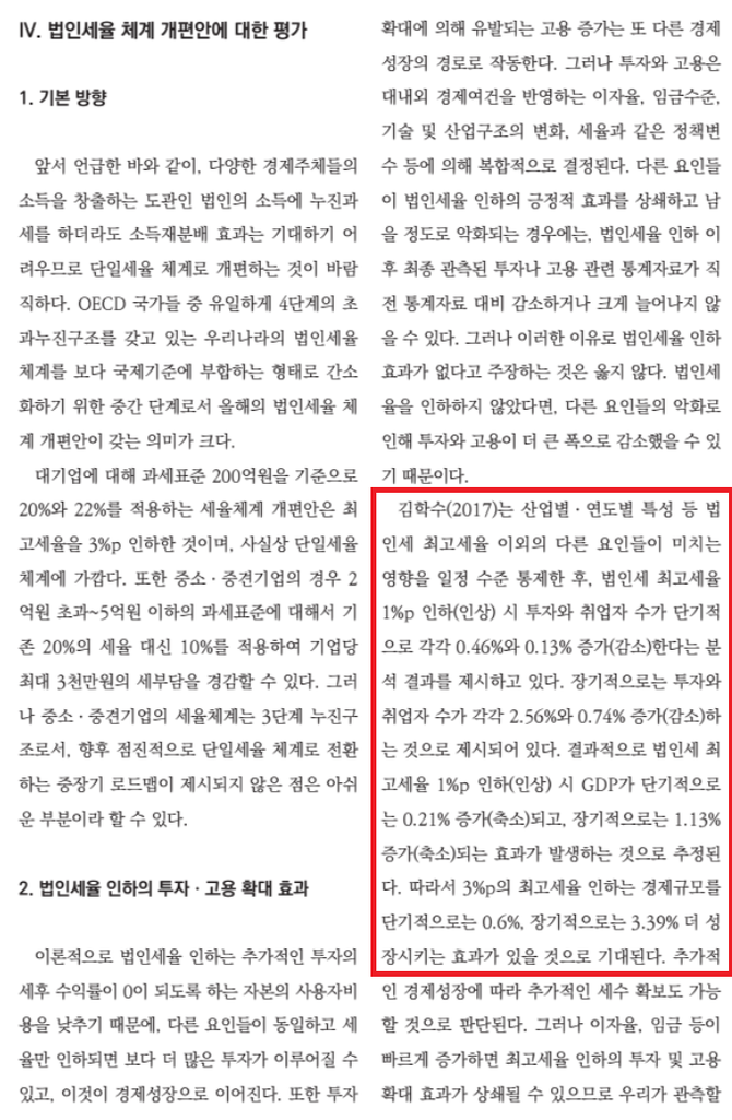 세 번째, 이 보고서의 핵심은 법인세 인하가 어느 정도의 투자‧고용 증대를 야기하느냐인데 이에 대한 기반 연구, 혹은 참고 연구는 김학수 선임연구위원이 과거 자신이 연구했던 것을 인용했다.
