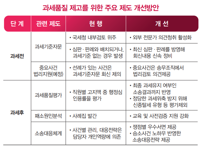 납세자에게 잘못 부과한 세금, 또는 잘못 대응한 세금 등 부실과세를 최대한 줄이겠다는 의도에서다. 특히 주목받는 것은 조사부터 소송까지 각 단계별 유기적 관리를 강화하고, 법리기준 검토 시 외부의견 활성화에 박차를 가한다.