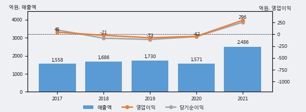 최근 실적을 살펴보면 2021년 매출액이 최근 5년 중 가장 높은 실적을 기록했음을 알 수 있다. 이전 최고 실적이었던 2019년 보다도 43.7%(755억 7천만원) 늘어난 것으로 나타났다.