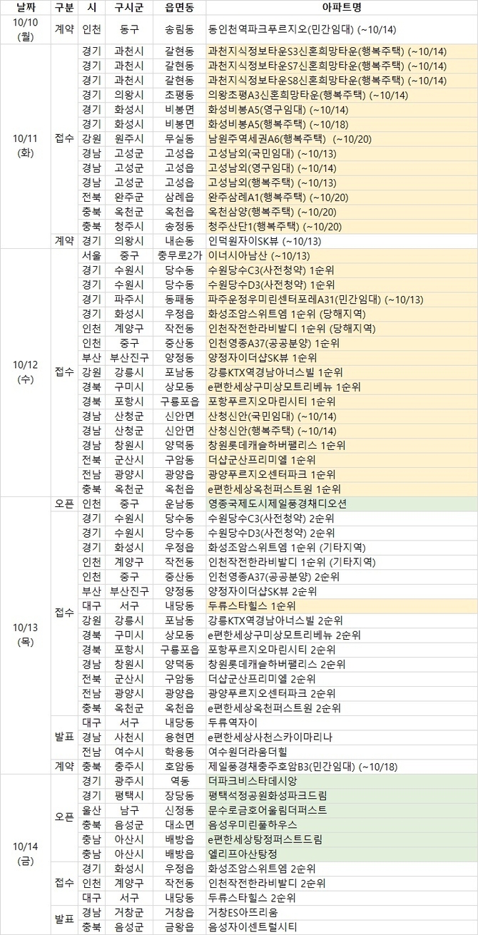 주요 분양물량은 인천 계양구 작전동 '인천작전한라비발디', 충북 옥천군 옥천읍 'e편한세상옥천퍼스트원', 경북 포항시 구룡포읍 '포항푸르지오마린시티' 등이다.