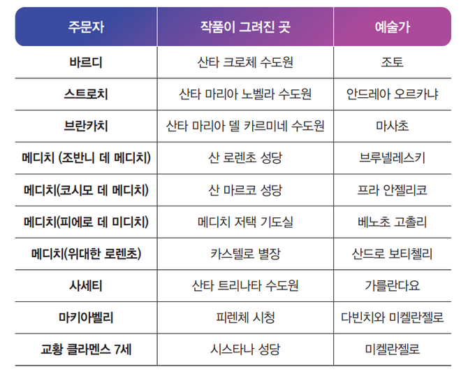 어떤 상인과 교회 그리고 예술가들이 연결되었을까요? 우선 표를 보시죠. 익숙한 이름들과 장소들이 대거 등장하죠? 당연히 이탈리아 르네상스 시기 활동하였던 예술가들이 유명하니까 그렇겠죠. 그리고 성당들도 이탈리아 여행을 가셨던 분들은 아마도 이 중 한 곳 정도는 방문하셨을 겁니다.