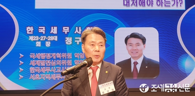 1주제 발표자로 나선 정구정 역대회장은 “김완일 회장과는 고시회장을 할 때, 상임이사를 하셨다. 그 이후 김완일 회장은 많은 법을 개정하는데 함께 해 주셨다. 우리 세무사업계가 앞으로 어떻게 미래를 준비하면 좋겠느냐는 김완일 회장의 요청을 받고 이자리에 섰다”고 말문을 열었다.