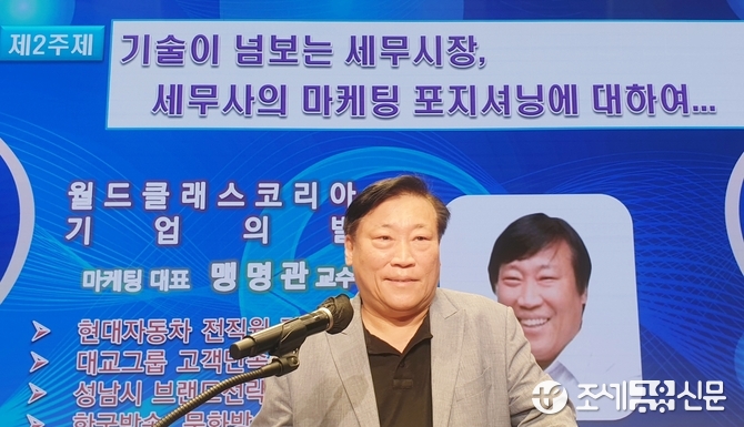 제2주제 발표자로 나선 맹명관 교수(월드클래스코리아 기업의별 마케팅 대표)가 ‘기술이 넘보는 세무시장, 세무사의 마케팅 포지셔닝’에 대해 ▲파트1:서바이벌 프라임-위드코로나 으뜸 생존법 ▲파트2:세무사 업의 확장을 위한 미래전략-세무사 마케팅 4.0에 대해 열강을 했다.