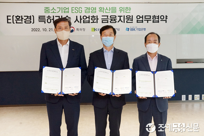 (조세금융신문=최주현 기자) 기술보증기금(기보)은 특허청, 중소기업은행과 '중소기업 ESG(환경·사회적 책무·기업지배구조 개선) 경영 확산을 위한 E(환경) 특허기술 사업화 금융지원 업무협약'을 맺었다.