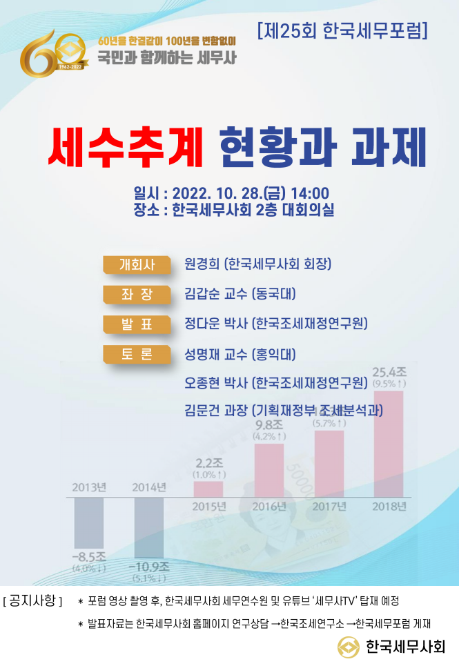 (조세금융신문=고승주 기자) 한국세무사회(회장 원경희)가 28일 오후 2시부터 서초동 회관 2층 대회의실에서 제25회 한국세무포럼을 개최하고, 지난 2년간 110조원 오차를 낸 정부 세금수입 추계(이하 세수추계)에 대한 개선점을 모색한다.