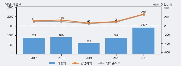 최근 실적을 살펴보면 2021년 매출액이 최근 5년 중 가장 높은 실적을 기록했음을 알 수 있다. 이전 최고 실적이었던 2018년 보다도 57.0%(511억 2천만원) 늘어난 것으로 나타났다.