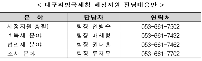 궁금한 사항은 대구국세청이나 세무서 ‘코로나19 세정지원 전담대응반’에 문의하면 된다.